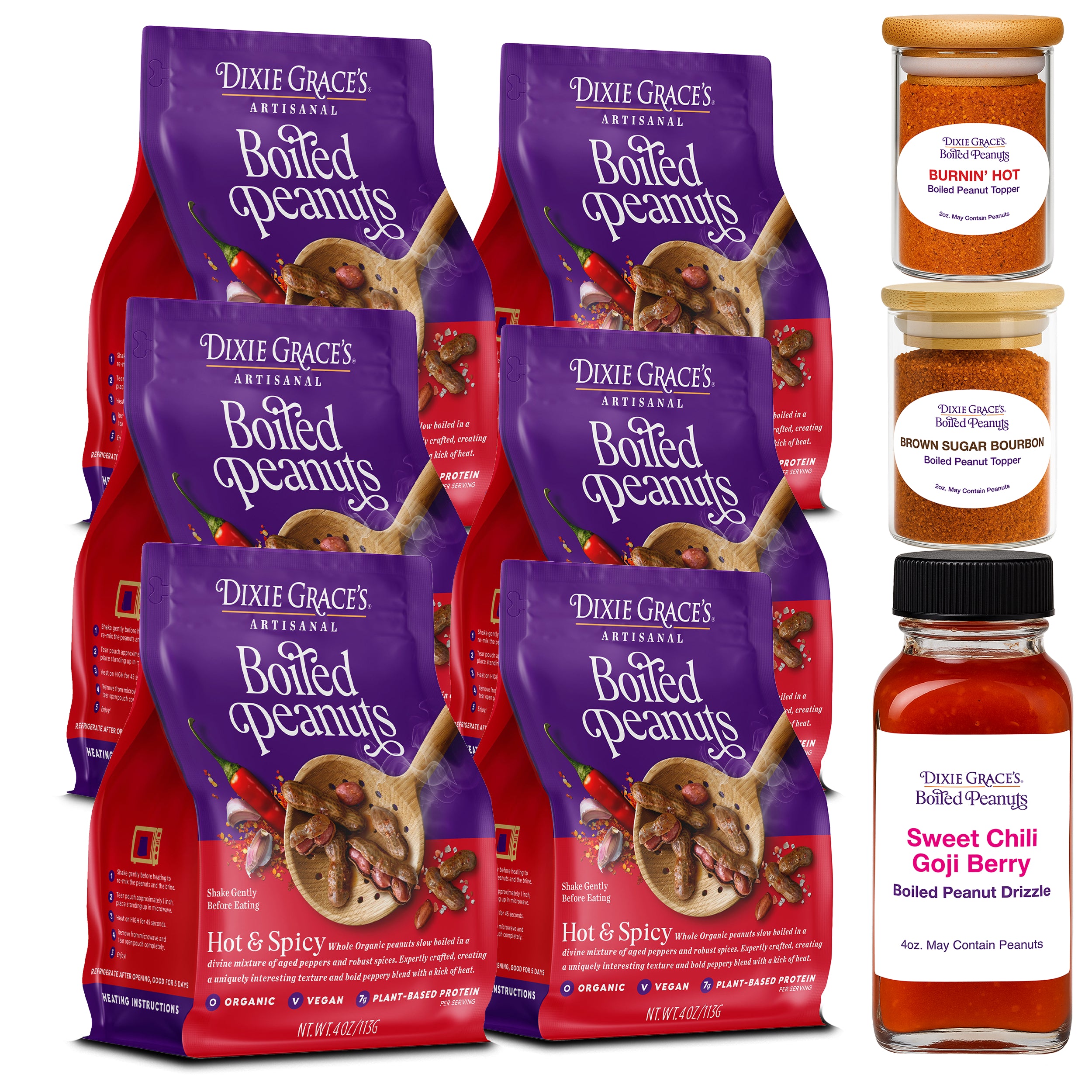 · Sweet Chili Goji Berry Drizzle: Water, Red Chilis, Apple Juice, Sugar, Vinegar, Goji Berries, Chili Flakes, Garlic, Xanthan Gum.